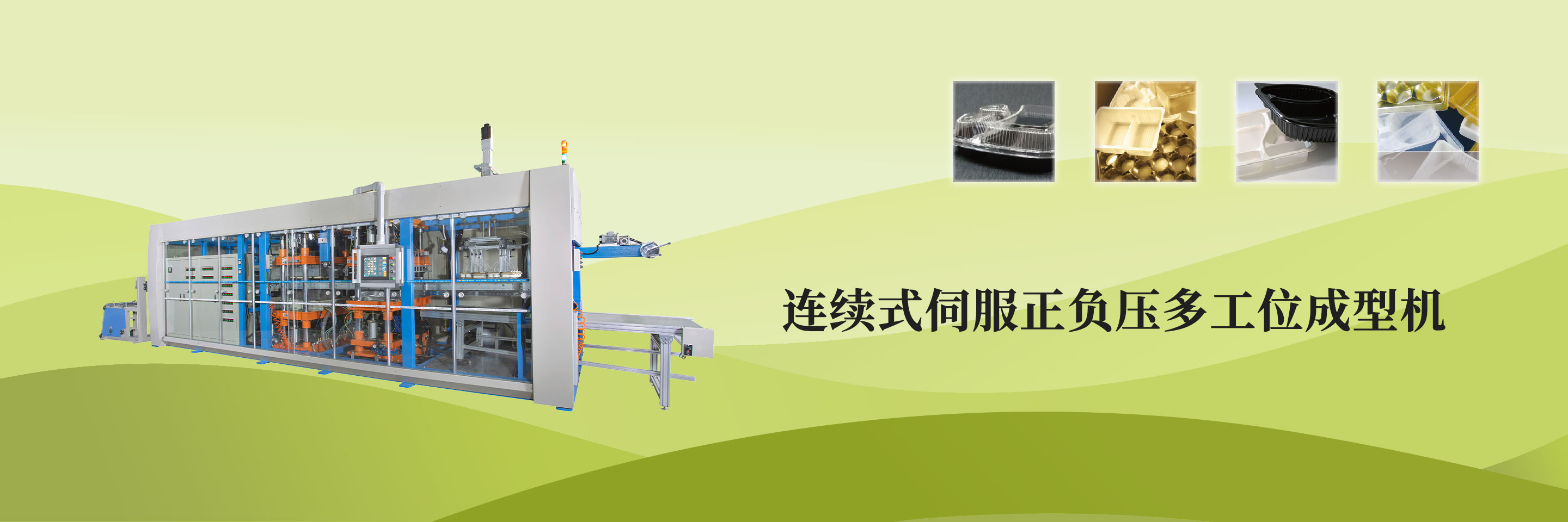 连续式伺服正负压多工位成型机」由机械设备取代人力的新式机种,也研发出非专用模具也可以在此机型做为应用,自动裁切、堆叠计数减少操作人员,降低成本节省了不少人力物力,时间,金钱,模具费用。